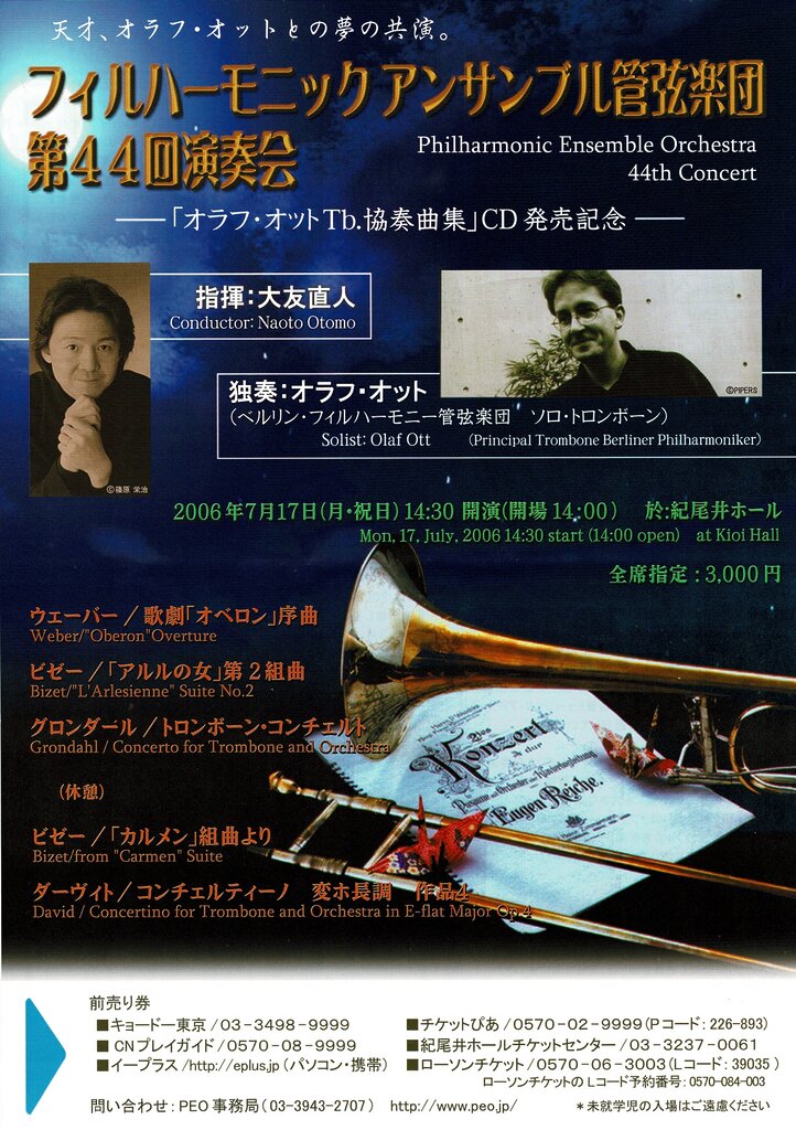 Concert at Kioi Hall with Mr. Olaf Ott, principal trombonist of the Berlin Philharmonic; conducted by Naoto Otomo, performing David’s Concertino, among other works.
